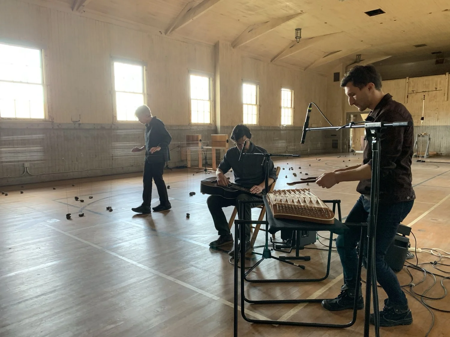 In the movements “Environmental Memory” and “Concentrated Merry-Go-Round”, Fullman incorporates Travis Andrew’s primary instrument, the guitar. Andy Meyerson and Fullman accompany the guitar in duo playing box bow and shoveler. For “Surface Narrative in Four Parts”, Meyerson also applies his percussion mastery to the hammered dulcimer. The dulcimer’s unique tuning is derived from the extended microtonal partials of the sequence played by Fullman on The Long String Instrument.